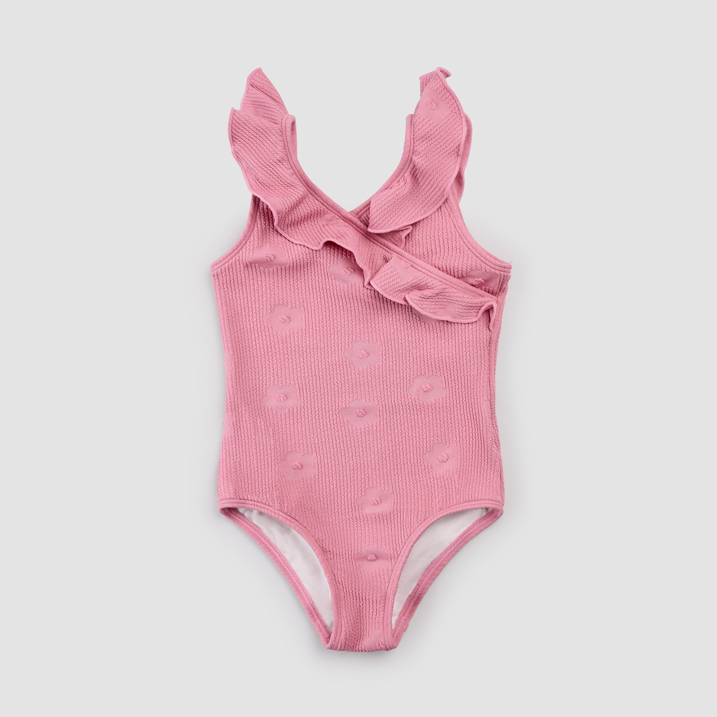 Pretty and playful, this crinkled swimsuit with flutter straps screams summer fun and all-day sunshine. Made with a stretchy, crinkled jacquard fabric with subtly floral motifs, the bodysuit is the perfect choice for your little sun dweller.