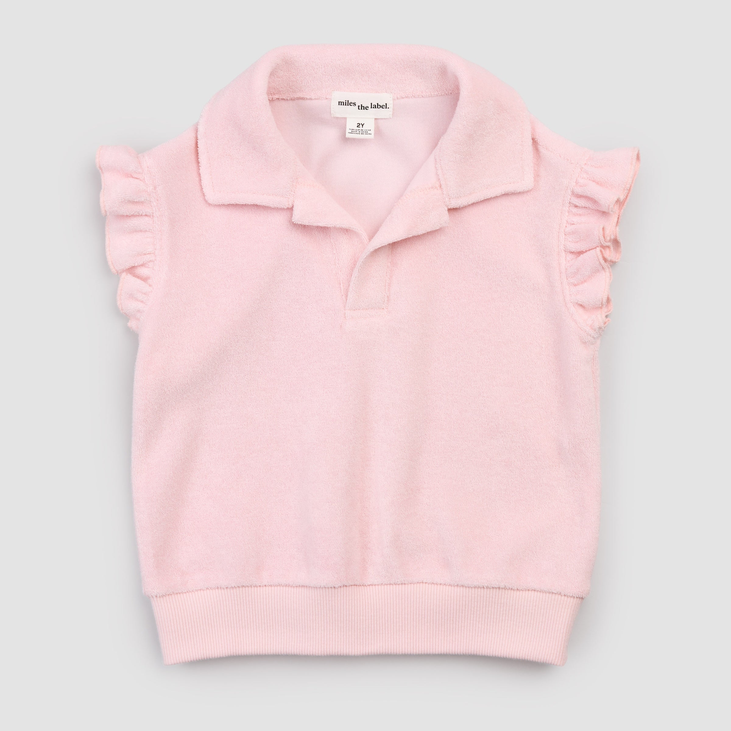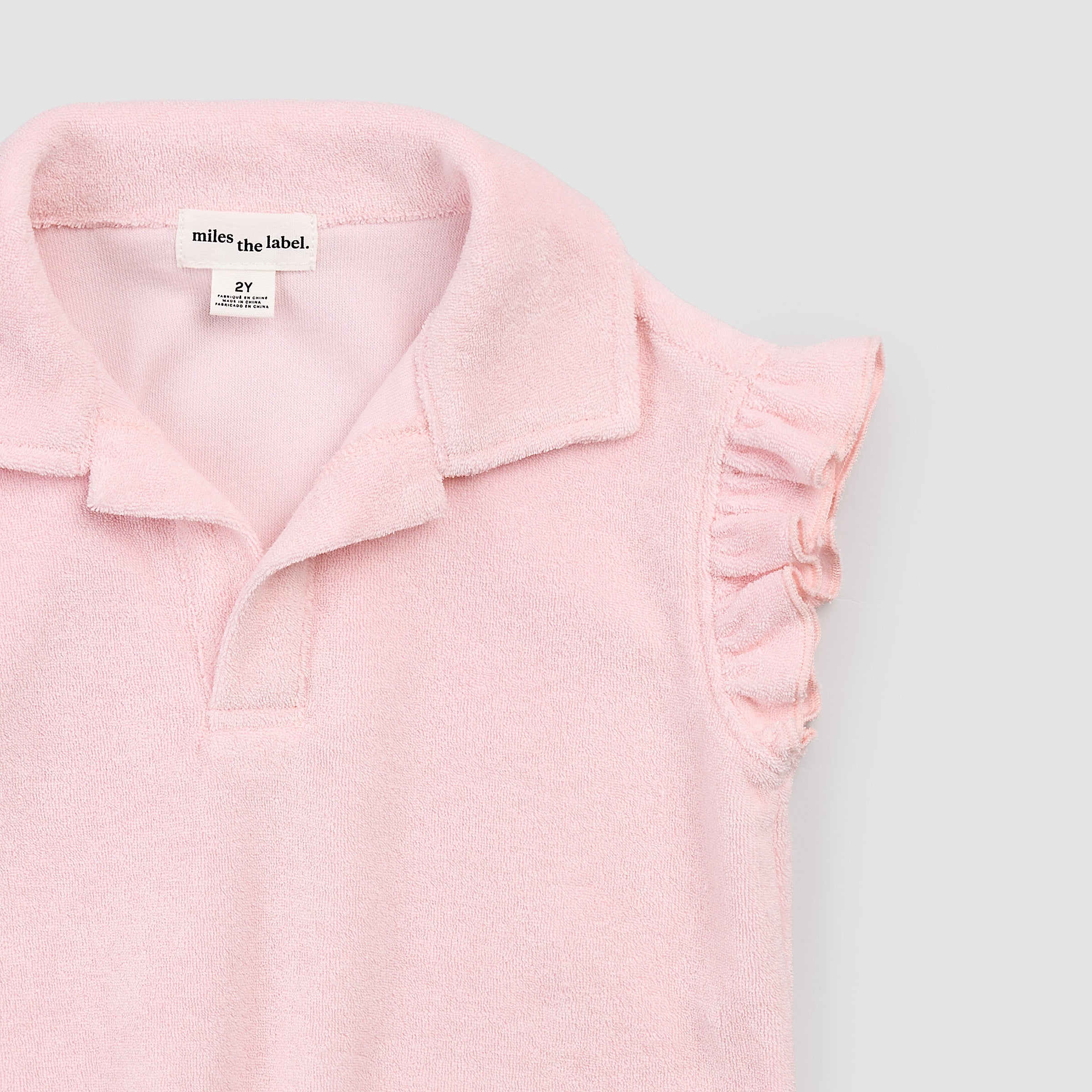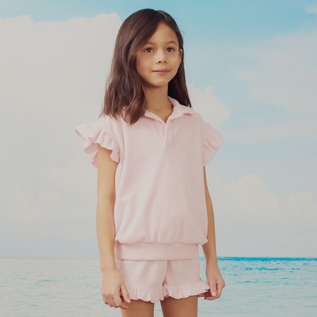 Soft as a cloud, this pink, flutter-sleeved top is made from a light terry cloth and is perfect for transitioning between exploring coastal towns to hitting the waves. The comfortable top is great for throwing on over her swimsuit and pairing with the coordinating shorts for a summery fit when heading home.