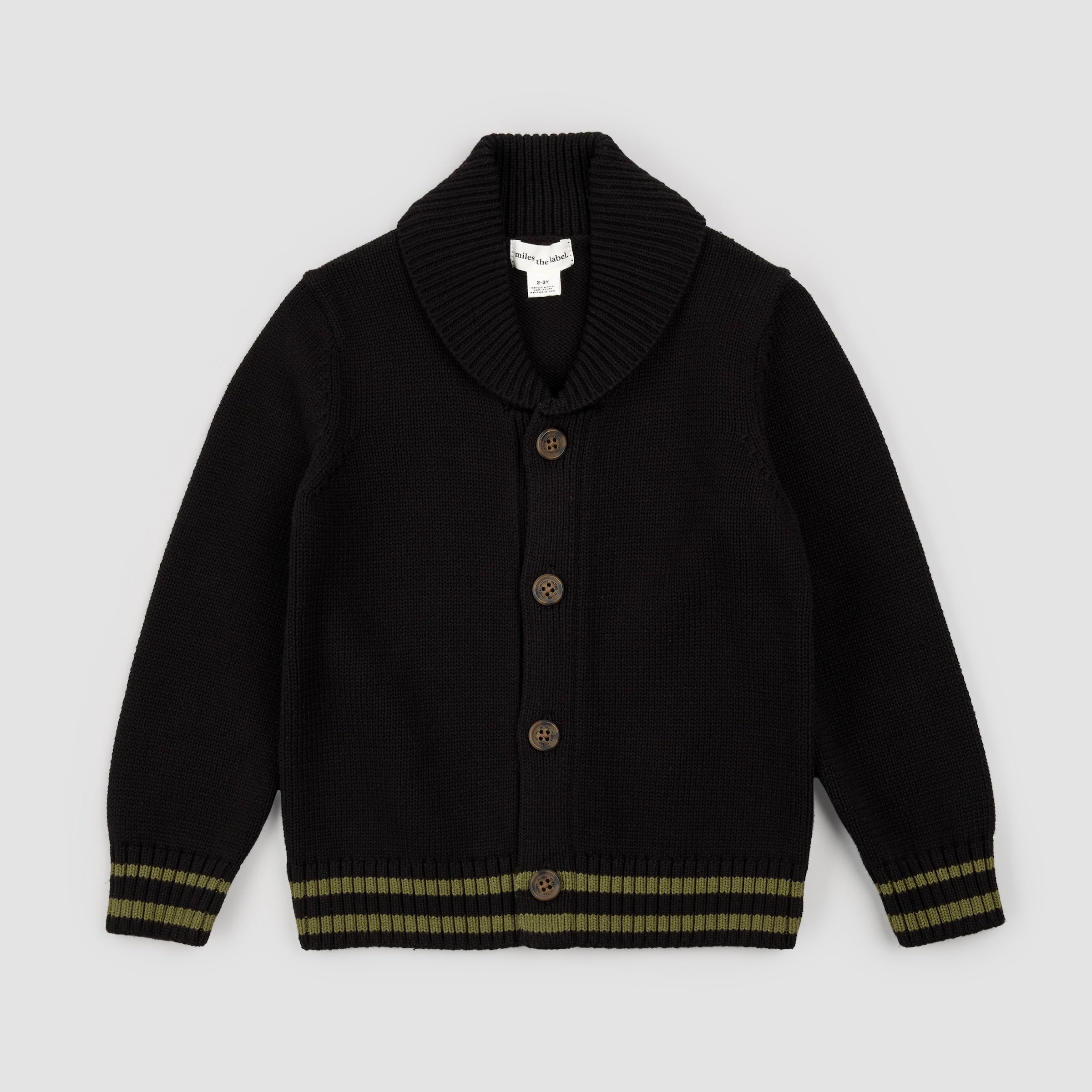 This classic black sweater is a refined yet cozy essential for cooler days. Crafted from organically grown cotton and fitted with a shawl neckline, the piece is soft and sophisticated. It’s finished with striped trims and buttons down the front for a timeless style.