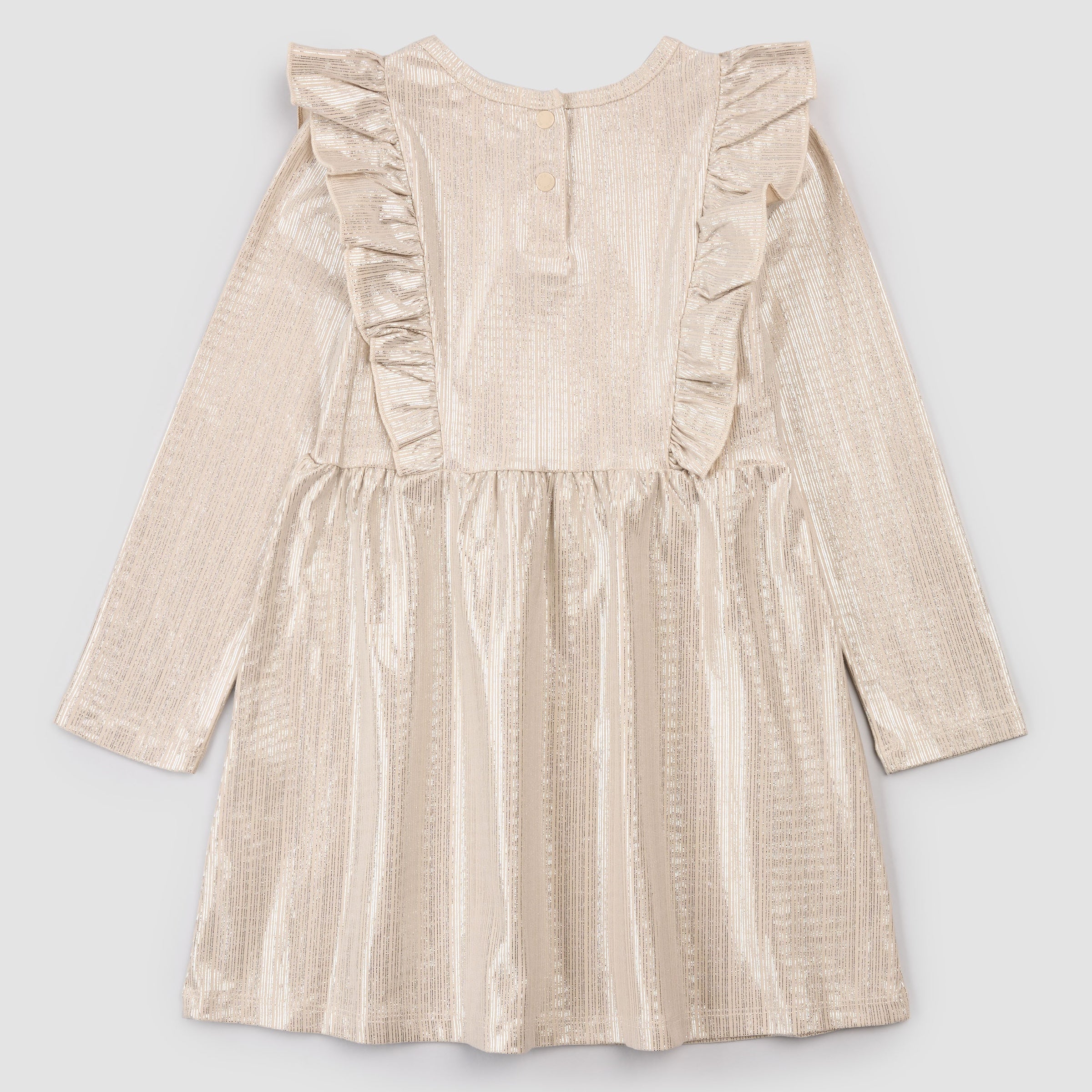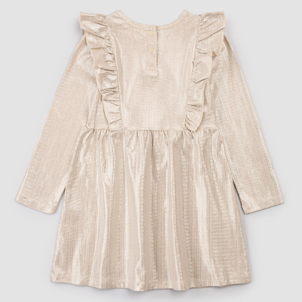 A little shimmer goes a long way to making every day feel like a special occasion. This gold, lamé jersey dress lets her sparkle her way through the day and features a delicate ruffle trim down both sides to add even more fun. A button placket at the back makes the dressy fit easy to pull on and off as she wriggles or dances.
