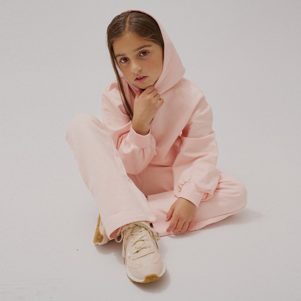 A simple staple for the colder months this subtly pink hoodie is made with a cozy organically grown cotton fleece. Perfect for layering over t-shirts and under jackets, the piece offers extra protection from the rain. With straight-cut joggers available to match, she’ll look as stylish as she is comfortable.