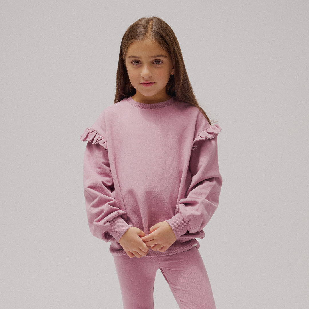 This cozy fleece crewneck is available in this season’s best colors, including this smoky purple piece. There’s matching leggings to complete the look and the puffy sleeves with ruffle detailing adds a little personality to the simple fit.