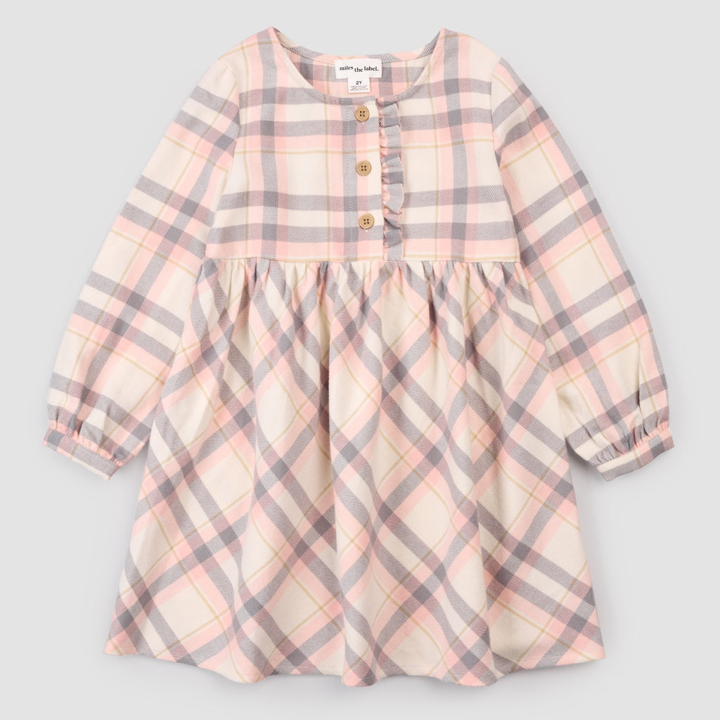Cette robe à smocks douillette est confectionnée en flanelle brossée toute douce et arbore un motif à carreaux indémodable, parfait pour les journées plus fraîches. La patte de boutonnage sur le devant est agrémentée d'un léger volant délicat, et les manches ont des poignets resserrés pour une touche élégante. Avec sa jupe fluide idéale pour tournoyer, la robe est parfaite pour les réunions de famille ou pour les après-midis de jeu entre amis.