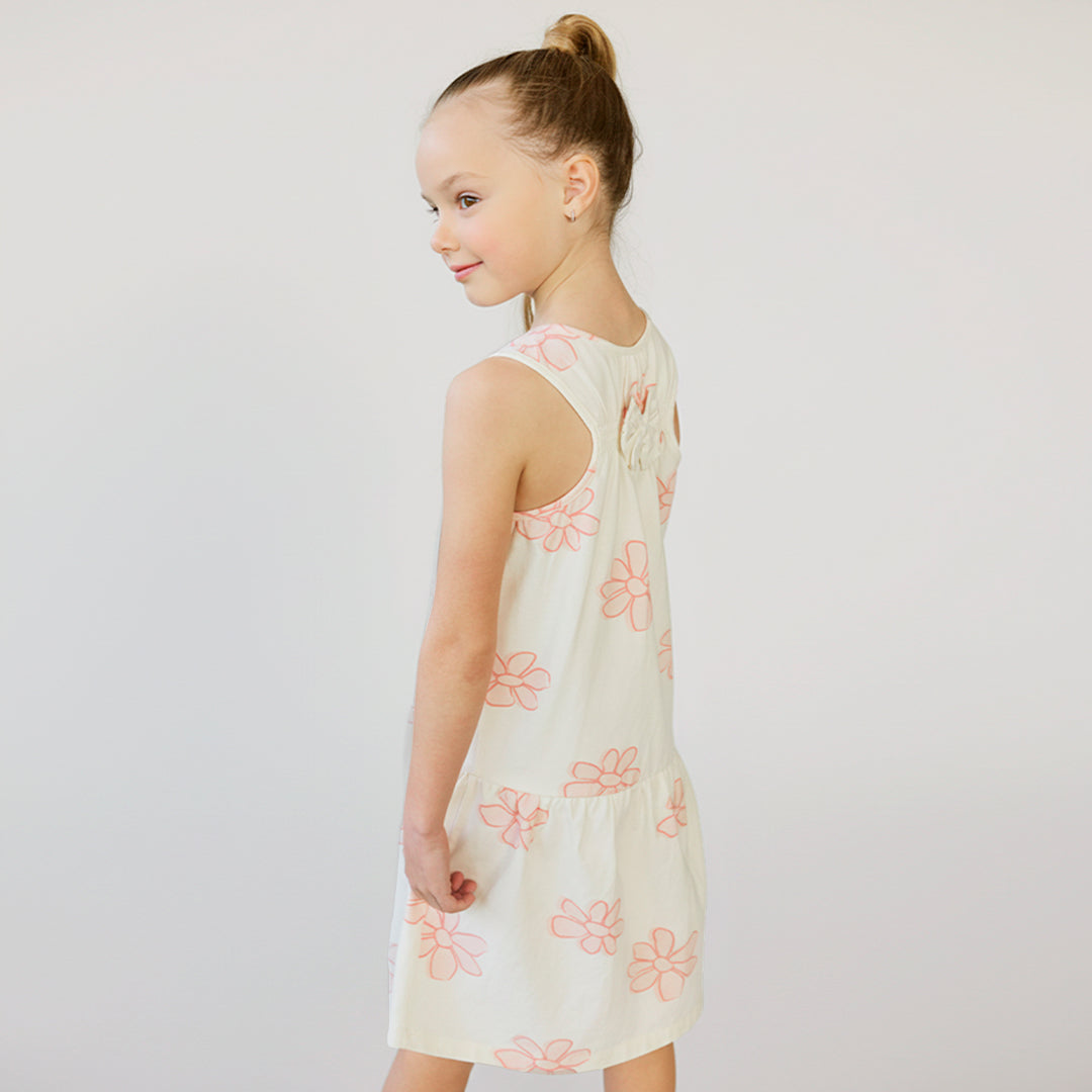 Mignonne et estivale, cette robe florale est parfaite pour virevolter lors des journées chaudes. Le jersey de coton biologique tout doux la garde confortable, tandis que le dos froncé et le détail du nœud ajoutent une touche charmante. Le haut style débardeur et la jupe à volants créent une silhouette facile et fluide, idéale pour les rencontres entre amies ou les pique-niques.